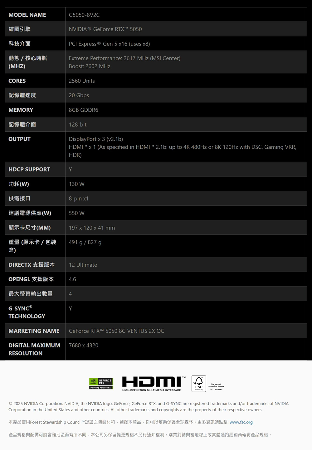 微星MSI RTX 5050 8G VENTUS 2X OC顯示卡