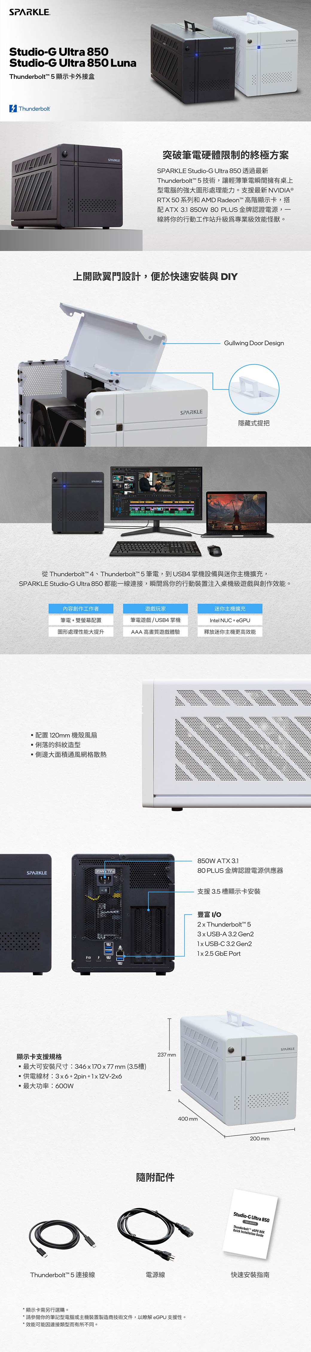 SPARKLE Thunderbolt™ 5 eGPU Studio-G 850 Luna Ultra 採用Intel® Barlow Ridge獨立控制晶片,為筆電提供桌機級GPU擴充能力。三大核心優勢:Thunderbolt™ 5超高速傳輸、業界最佳GPU安裝相容性(支援3.5槽/346mm)與850W 80PLUS金牌認證電源,完美應對各種高階顯示卡的供電需求。