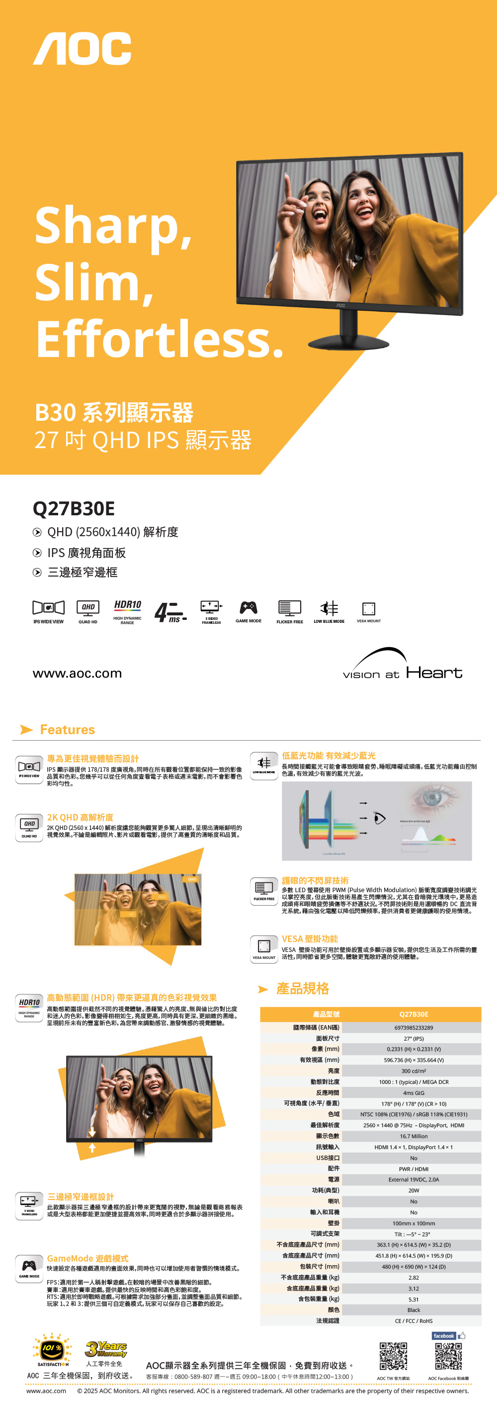 AOC 27型 Q27B30E IPS 2K QHD液晶顯示器