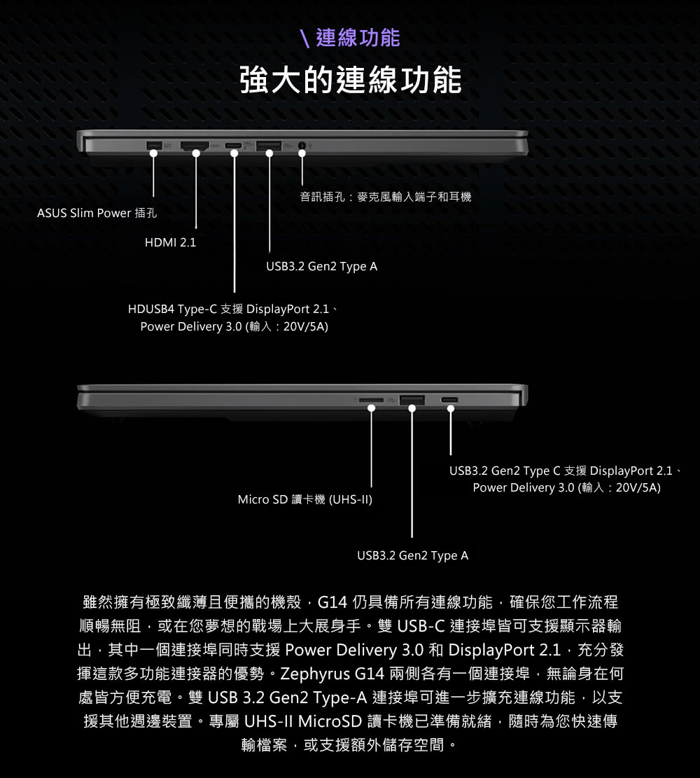 1x Type-C USB 4 with support for DisplayPort / power delivery (data speed up to 40Gbps)、1x USB 3.2 Gen 2 Type-C with support for DisplayPort / power delivery / G-SYNC (data speed up to 10Gbps)、2x USB 3.2 Gen 2 Type-A (data speed up to 10Gbps)、1x card reader (microSD) (UHS-II)、1x HDMI 2.1 FRL