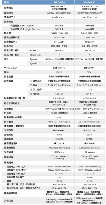 燈泡壽命、投影機規格:6000 / 12000 小時(Normal / Eco)投射比範圍、投影機規格:1.21-1.45尺寸 - 投影距離、投影機規格:34~337吋梯形修正、投影機規格:垂直正負30度(自動)、水平正負30度色彩重現、投影機規格:全彩 (10bits、up to 16.77 million colors)投影方式、投影機規格:RGB 三片 TFT LCD 同時聚合呈像投影像素數、投影機規格:Full HD 2,073,600 dots (1920 x 1080) x 3彩色亮度 - 彩色亮度輸出、投影機規格:4000 流明白色亮度 - 白色亮度輸出、投影機規格:4000 流明畫面比例、投影機規格:16:9原生解析度、投影機規格:1080P燈泡類型、投影機規格:230W UHE 燈泡 / ELPLP97支援最高傳送解析度、投影機規格:480i / 576i / 480p / 576p / 720p / 1080i / 1080p端子輸入、其他家用投影機:HDMI*2