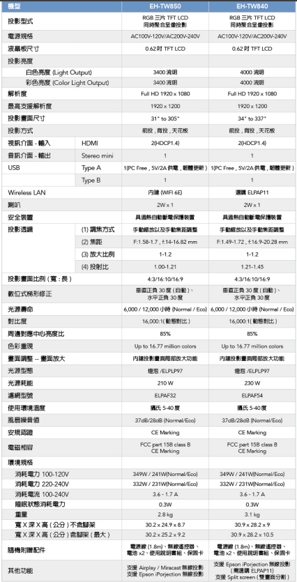 燈泡壽命、投影機規格:6000 / 12000 小時(Normal / Eco)投射比範圍、投影機規格:1.00-1.21尺寸 - 投影距離、投影機規格:31~305吋梯形修正、投影機規格:垂直正負30度(自動)、水平正負30度色彩重現、投影機規格:全彩 (10bits、up to 16.77 million colors)投影方式、投影機規格:RGB 三片 TFT LCD 同時聚合呈像投影像素數、投影機規格:Full HD 2,073,600 dots (1920 x 1080) x 3彩色亮度 - 彩色亮度輸出、投影機規格:3400 流明白色亮度 - 白色亮度輸出、投影機規格:3400 流明畫面比例、投影機規格:16:9原生解析度、投影機規格:1080P燈泡類型、投影機規格:210W UHE 燈泡 / ELPLP97支援最高傳送解析度、投影機規格:480i / 576i / 480p / 576p / 720p / 1080i / 1080p端子輸入、其他家用投影機:HDMI*2