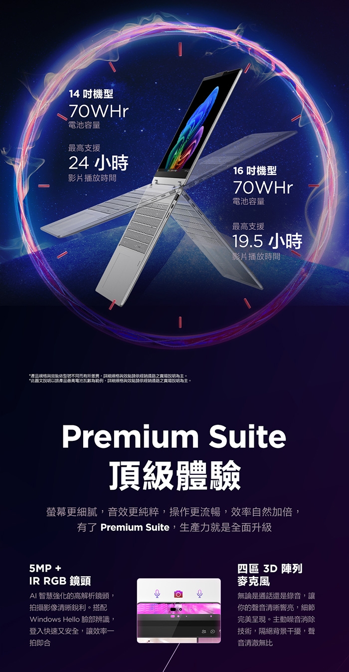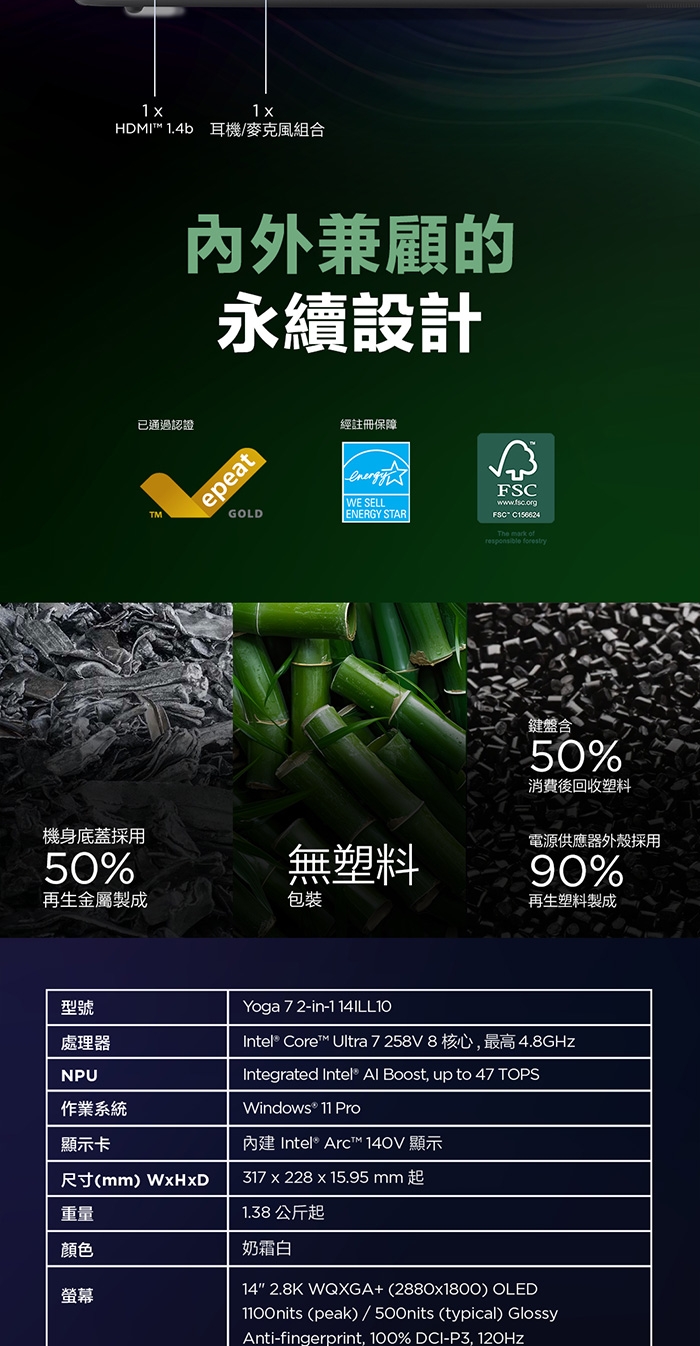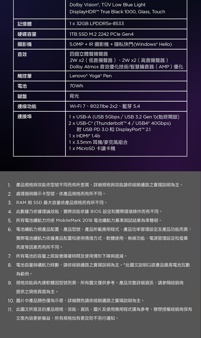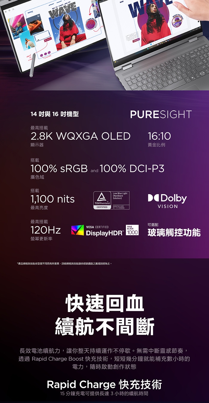 14吋 2.8K WQXGA+ (2880x1800) OLED 1100nits (peak) / 500nits (typical) Glossy / Anti-fingerprint, 100% DCI-P3, 120Hz, Dolby Vision, TUV Low Blue Light, DisplayHDR True Black 1000, Glass, Touch