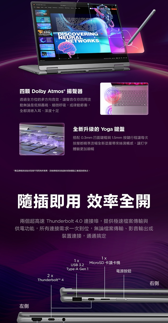 1x USB-A (USB 5Gbps / USB 3.2 Gen 1)、1x USB-A (USB 5Gbps / USB 3.2 Gen 1), Always On、2x USB-C (USB 10Gbps / USB 3.2 Gen 2), with USB PD 3.0 and DisplayPort 1.4、1x HDMI 2.1, up to 4K/60Hz、1x Headphone / microphone combo jack (3.5mm)、1x microSD card reader