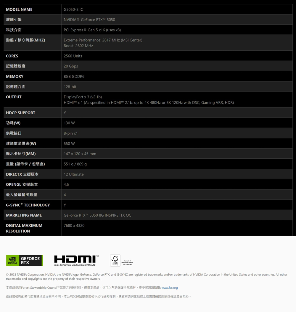微星MSI RTX 5050 8G INSPIRE ITX OC顯示卡