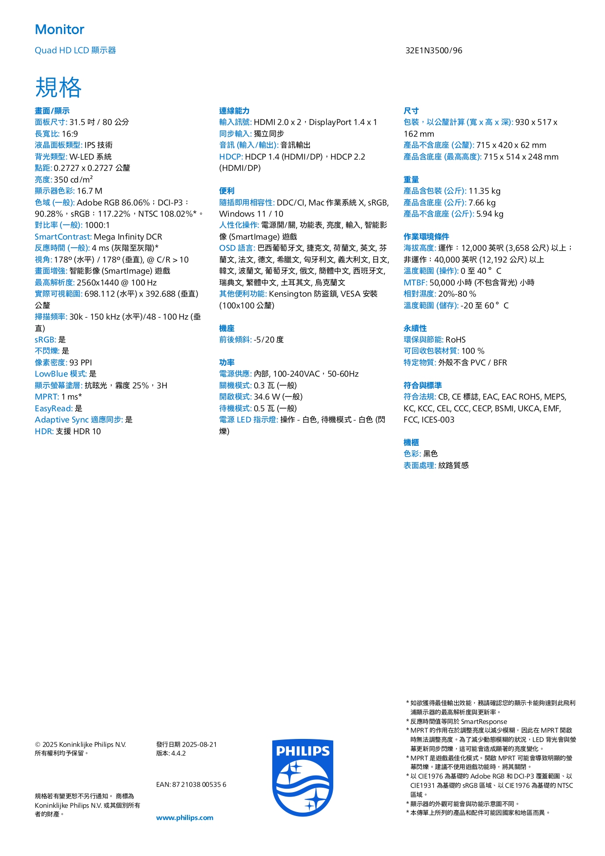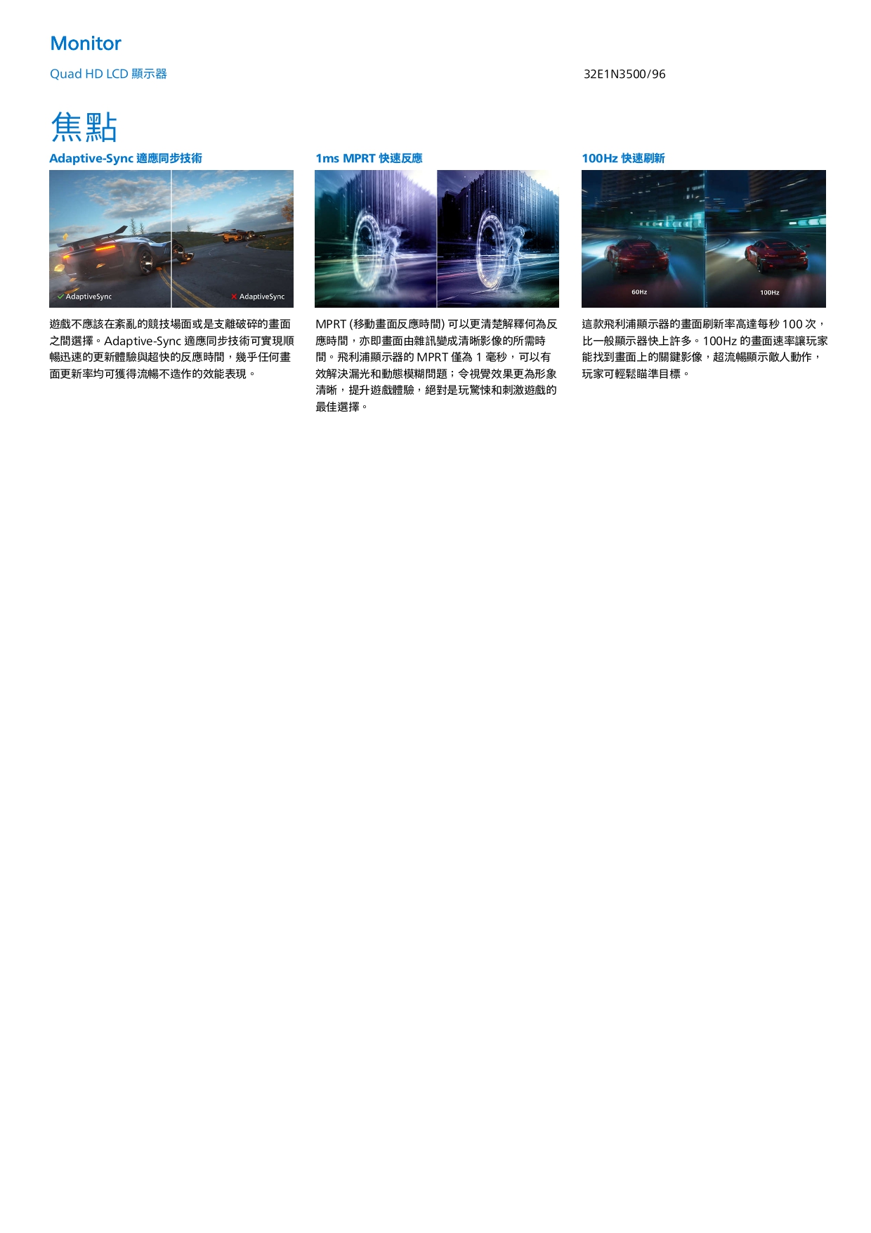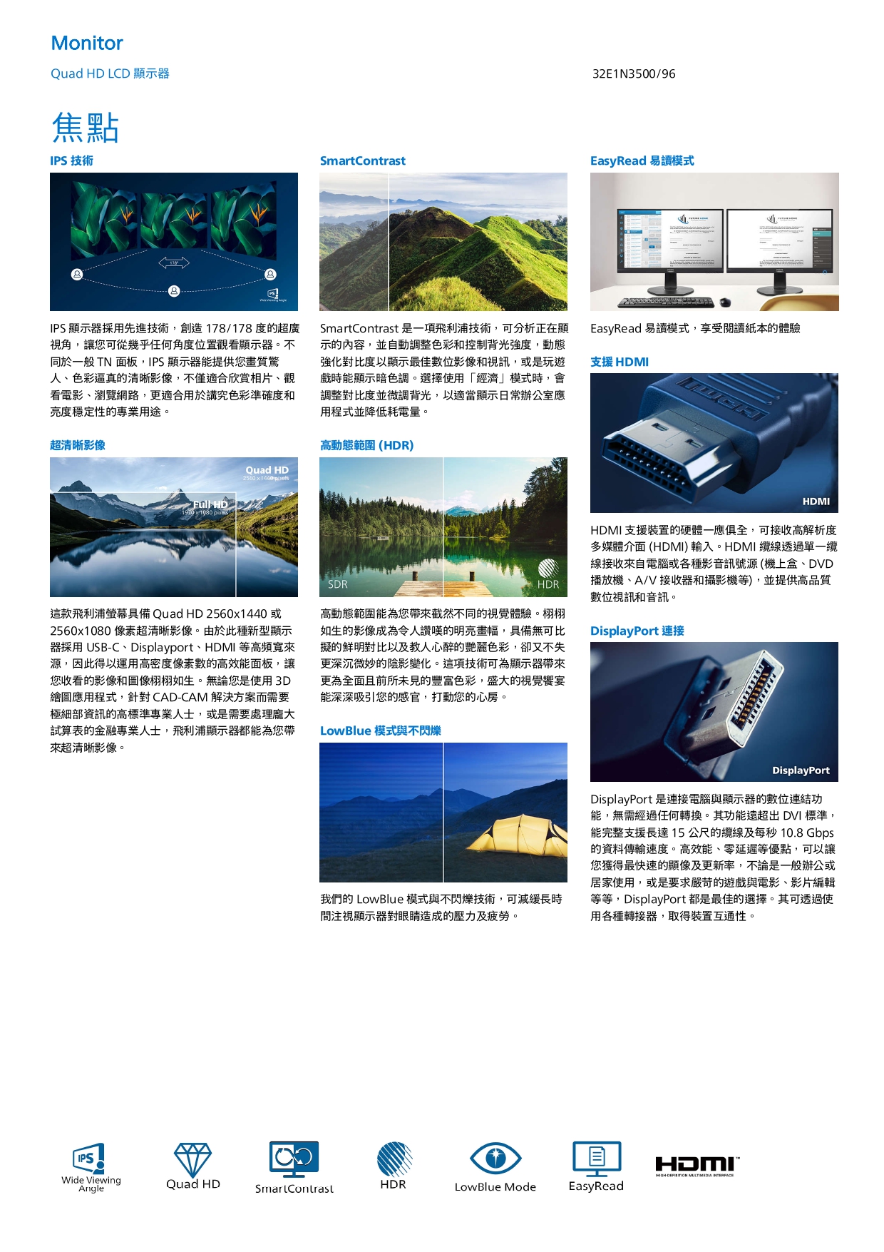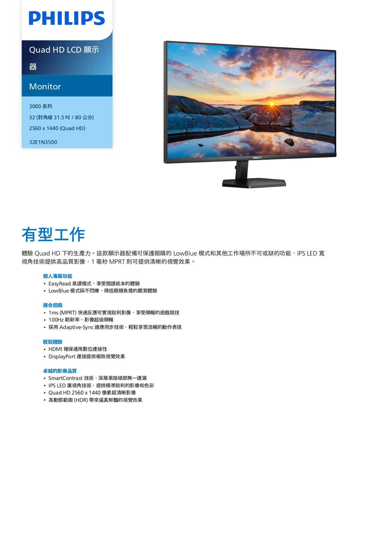 PHILIPS 32型 32E1N3500 Quad HD液晶顯示器