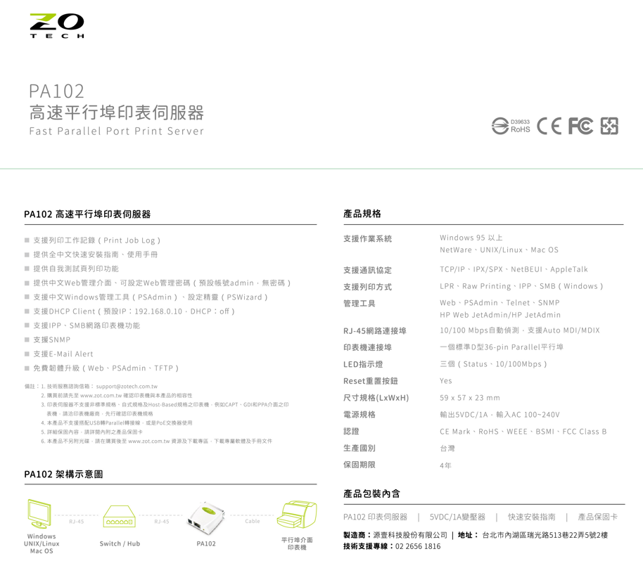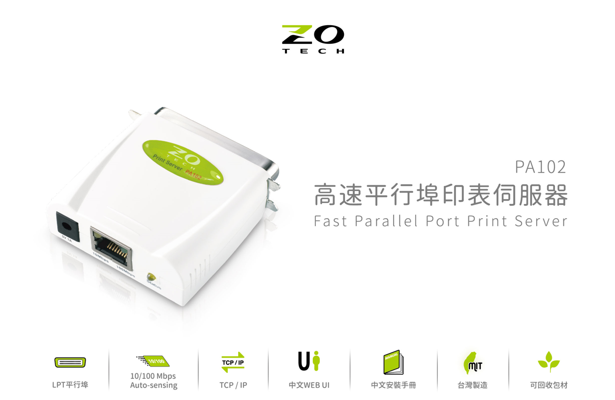 ZO TECH PA102 平行埠印表伺服器(綠色)